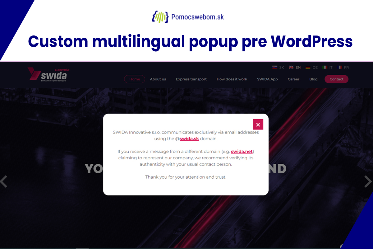 Pre klienta som riešil urgentnú požiadavkou na zobrazenie dôležitého informačného popup okna na viacjazyčnom WordPress webe. Popup mal slúžiť ako bezpečnostné upozornenie pre návštevníkov webu a zobrazovať sa na všetkých jazykových mutáciách stránky.