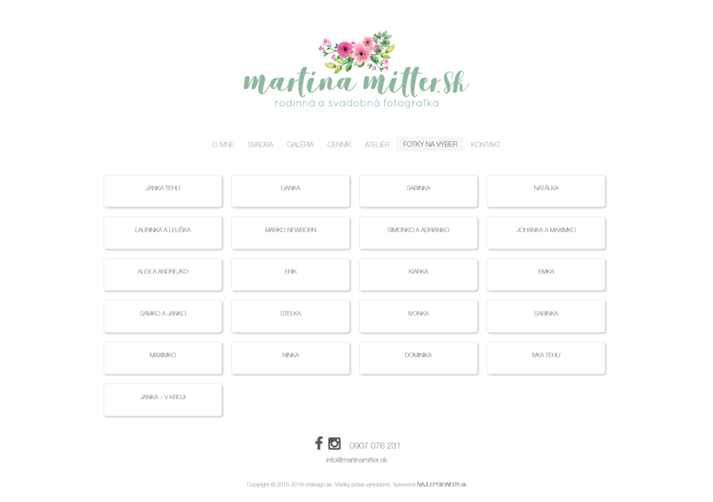 Pre fotografku Martinu Mitter som vytvoril modernú a elegantnú webstránku, ktorá slúži ako prezentácia jej portfólia a zároveň umožňuje jednoduchú prácu s klientmi. Stránka je postavená na WordPresse a obsahuje prehľadné galérie a albumy z fotení, ktoré sú chránené heslom. Klienti sa po prihlásení do svojho albumu môžu pohodlne prezerať fotografie a vyberať si tie, ktoré si chcú nechať vytlačiť.